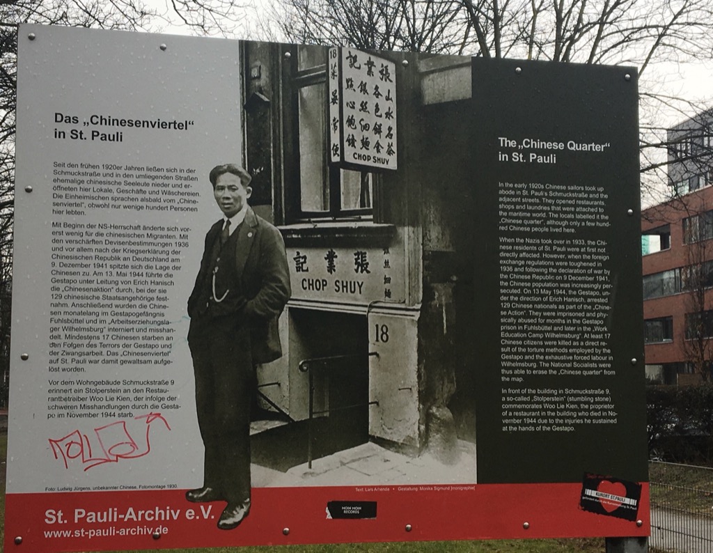 Aufgrund der Globalisierung, insbesondere seit der Reform- und Öffnungspolitik Chinas, reisen immer mehr chinesische Tourist*innen nach Deutschland. Mir wurde als chinesischem Germanisten nicht selten die Frage gestellt: Warum gibt es in Deutschland keine Chinatowns? In der Tat gab es in der deutschen Geschichte einige Chinatowns, vor allem in Hamburg, Bremen und Berlin, die jedoch von den Nationalsozialisten auf brutale Weise zerstört wurden. Hamburgs Chinatown bzw. das Hamburger Chinesenviertel, das sich um die Schmuckstraße im Grenzgebiet zwischen St. Pauli und Altona befand, wurde am 13. Mai 1944 unter Leitung der Gestapo mit dem Handlungsslogan Chinesenaktion zerstört, mit deren unmenschlicher und rassistisch motivierter Räumung und Deportation sich der Historiker Lars Amenda bereits 2005 auseinandersetzte. Nichtsdestotrotz ist diese unrühmliche Geschichte der heutigen deutschen Bevölkerung vorwiegend unbekannt.